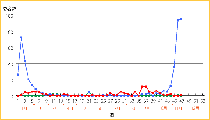 インフルエンザが流行しています。2025年もコロナ感染者数とインフルエンザ患者数をグラフにします。
